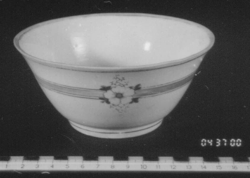 Kom, polychroom beschilderd, voorzien van bies met bloem.
