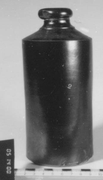 Kruik, cylindervormig, bruin geglazuurd, voorzien van schenktuit.