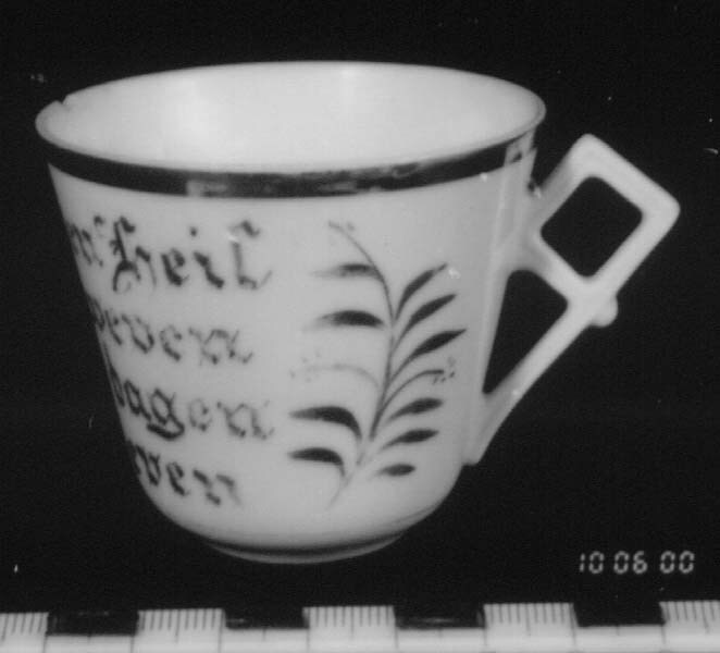 Kop, wit met goud beschilderd, voorzien van spreuk.