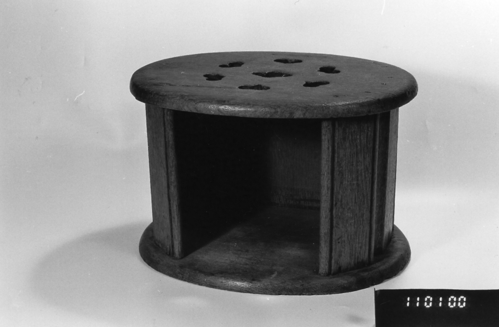 Stoof, ovaal, bovenblad versierd met zes uitgesneden hartjes en een vierpas. Zijkant bestaande uit zeven plankjes met ribbel in reliëf.