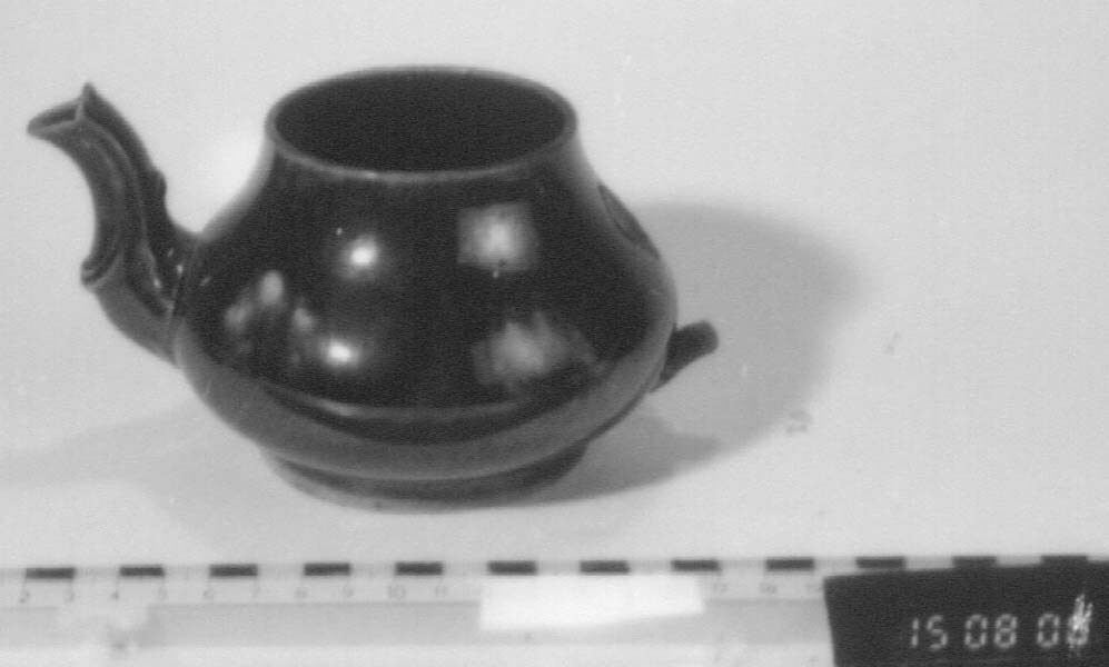 Theepot, bruin geglazuurd met lichtere plekken, zonder handvat, tuit voorzien van reliëfribbels.