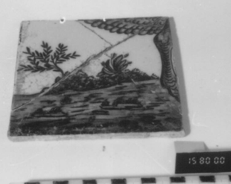 Tegel, paars beschilderd, drie in totaal, deel van een tableau met voorstelling van een haan(?).