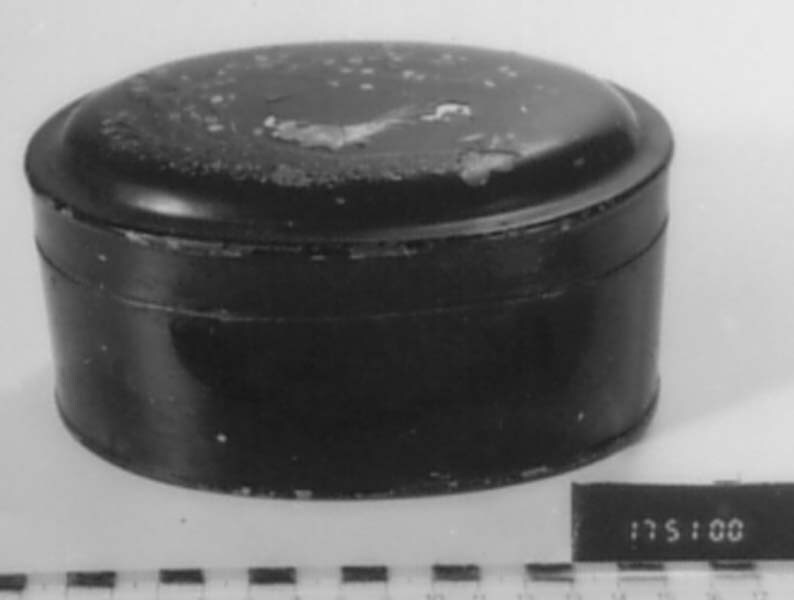 Koektrommel met scharnierend deksel, ovaal, zwart, ingelegd met polychroom parelmoer, met voorstelling van haan en tak met bloemen.