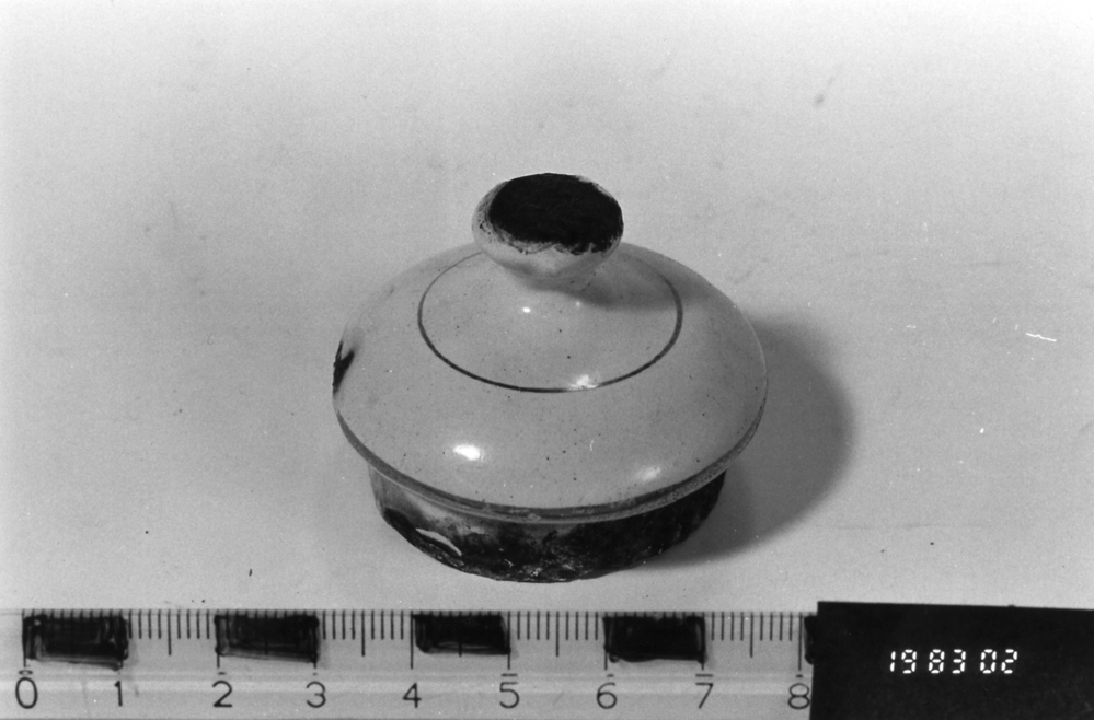 Theepotdeksel, wit, voorzien van gouden bies langs de rand en de knop.