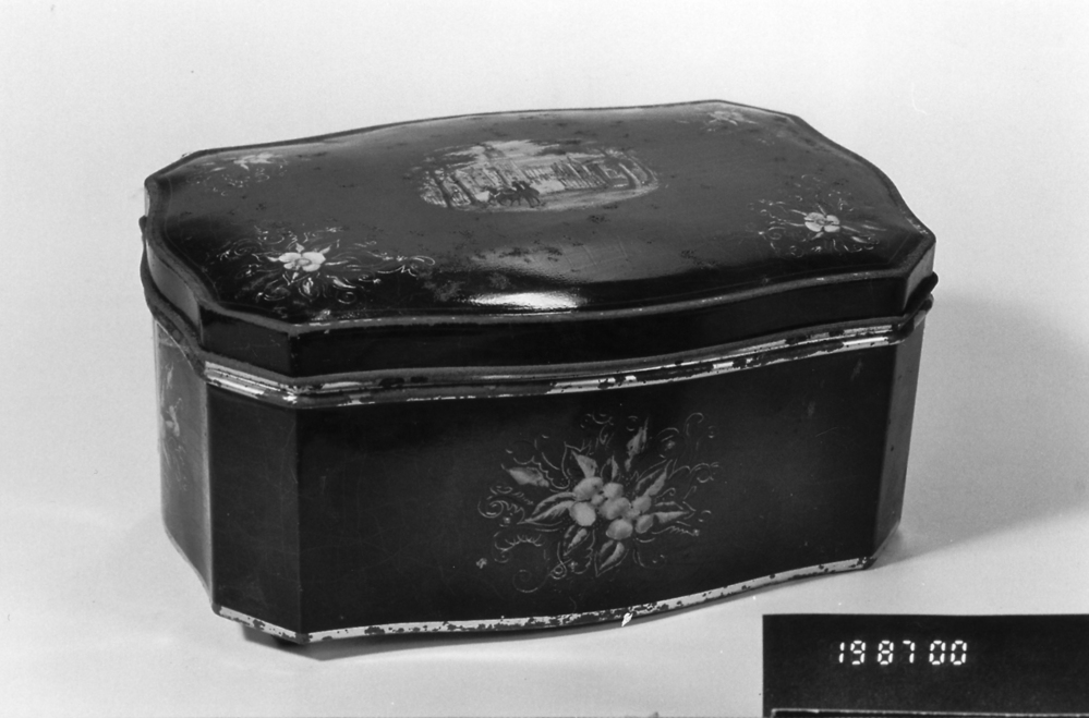 Koektrommel, rechthoekig met afgeplatte hoeken, groen, polychroom beschilderd met bloemen op de zijkanten.