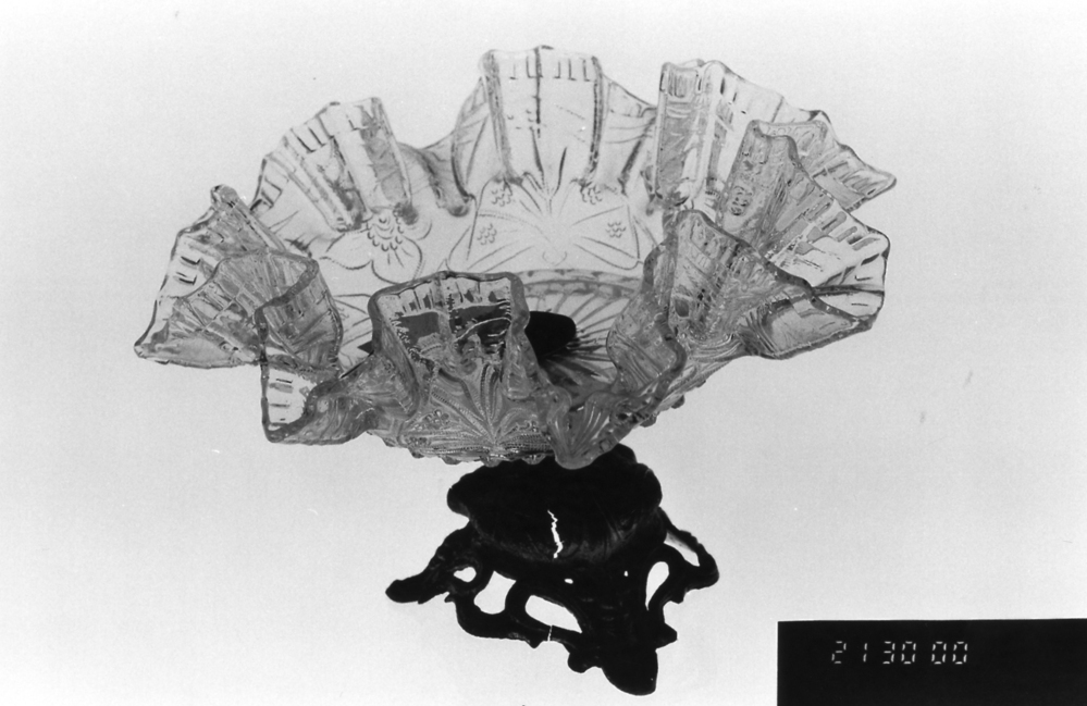 Fruitschaal, rond met geplooide kelk en bewerkte driehoekige voet, voorzien van florale motieven in reliëf.