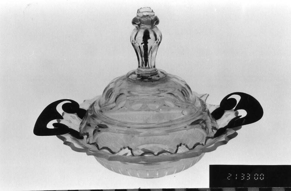 Bobonniere, transparant en rond met geschulpte rand, met twee gekrulde platte oren, grijs, voorzien van gegraveerde geometrische en florale motieven.