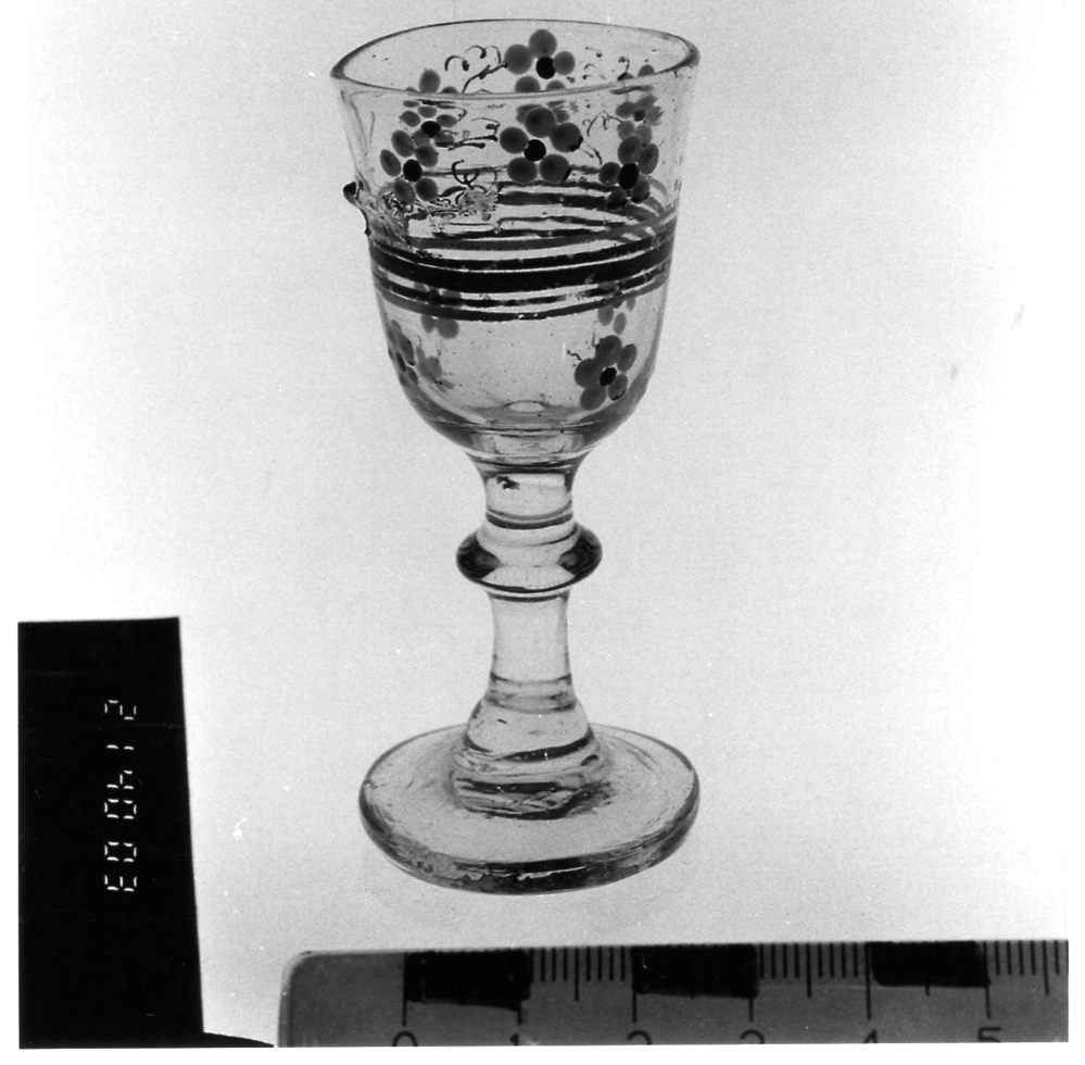 Borrelglas op steel met knop en ronde voet, goud, blauw, wit en rood gedecoreerd, voorzien van strepen en florale motieven op de kelk.
