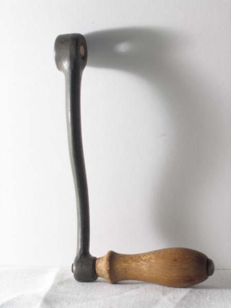 Slinger, s-vormig met haaks handvat, grijs en bruin, vermoedelijk van gehaktmolen.
