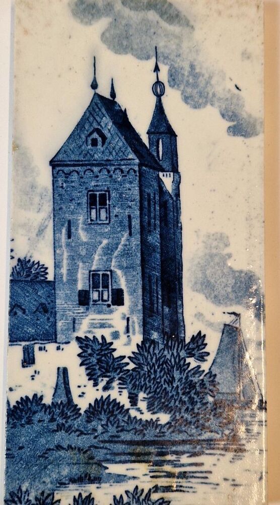 Tegel van een kasteel met op de achtergrond een zeilboot.