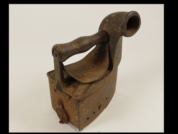 Strijkijzer, ijzer met houten handvat, te verwarmen met kooltjes.
