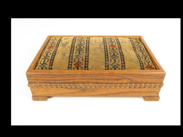 Houten voetenbankje. Kussen uitneembaar en met textiel bekleed.