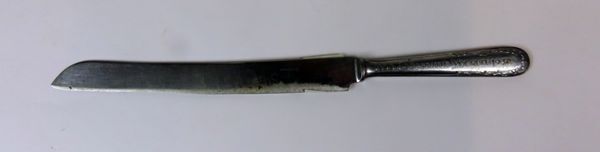 Mes, zijnde een broodmes. Op het heft voorzien van een opschrift en aan onderzijde versoeringbladerrank.