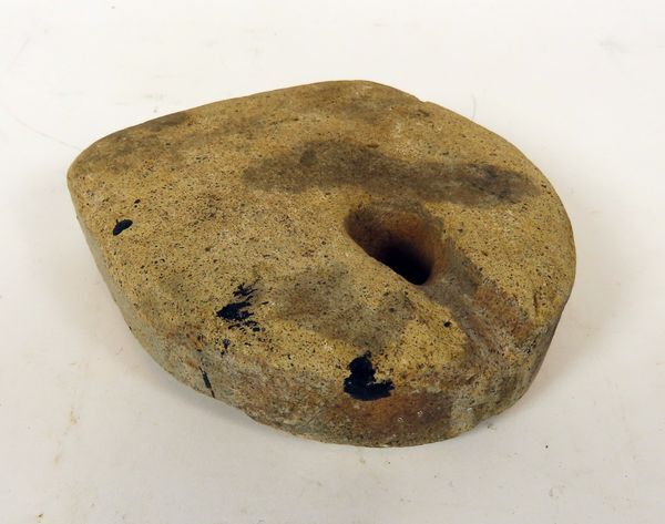 Licht geel ovaal stuk steen dat aan een kant is afgeplat. Tegenover de afgeplatte zijde zit er een ronde opening in. Dergelijke stenen werden gebruikt voor verzwaring van een visnet. Bij gebruik aan een zeegnet, worden deze stenen ook wel zegenstenen genoemd.
