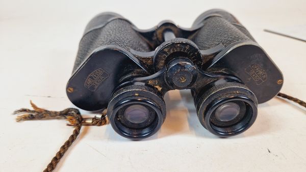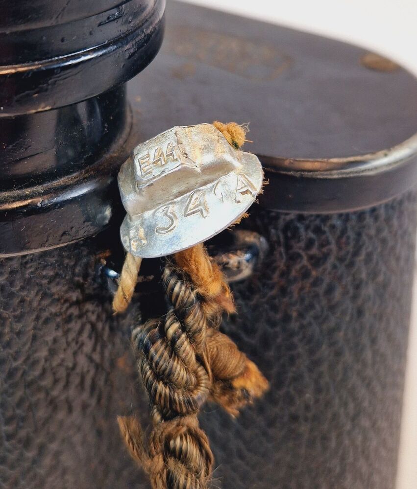 Carl Zeiss Jena Dekaram 10X50 kijker. De kijker heeft een beschadiging binnen in het lenzen stelsel. Het serienummer heb ik niet kunnen vinden, waardoor de juiste datering moeilijk is. Aan het "draaglint"is een "perfra" loodje vastgemaakt met als tekst E44 R341A. De betekenis of herkomst van dit loodje heb ik ook niet kunnen vaststellen.