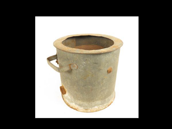 Rond metalen kacheltje met 2 hengsels en een vaste binnenpot. Aan beide kanten zit een ronde inlaat en twee handvatten. Noodkacheltje gebruikt in de 2e wereldoorlog.