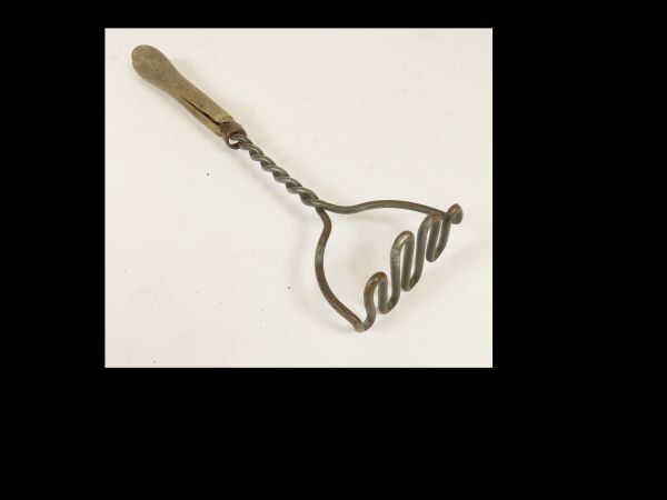 Metalen stamper, ook wel aangeduid als puree- of stamppotstamper, bedoeld om gekookte aradappelen fijn te stampen en te vermengen met groenten.