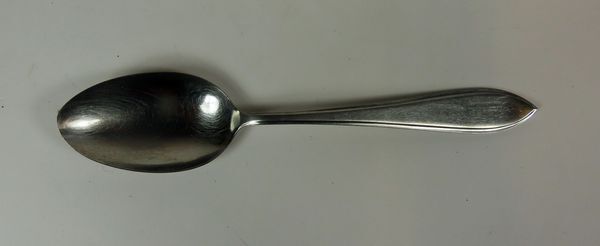 Tafellepel, metaal, twee groeven langs de in een punt uitlopende steel.