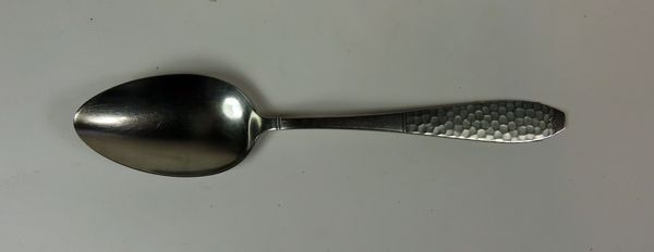 Tafellepel, twee dwarse trepjes over begin en midden steel, tweede helft gebobbeld; aan het uiteinde twee halve circels. Merkteken aan achterzijde.