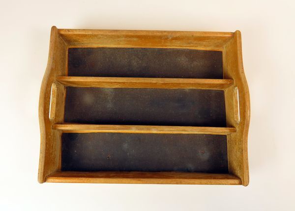 Bestekbak, hout, verdeeld in drie lengtevakkenmet een greep aan beide jkorte zijden. Bruin plastic beschermplaatje en de bakken.