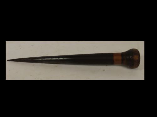 Conisch gevormde metalen pen met houten knop, een zogeheten marlspijker of marlpriem waarmee men touwen splitst. Tussen knop en pen zit een koperen ring.