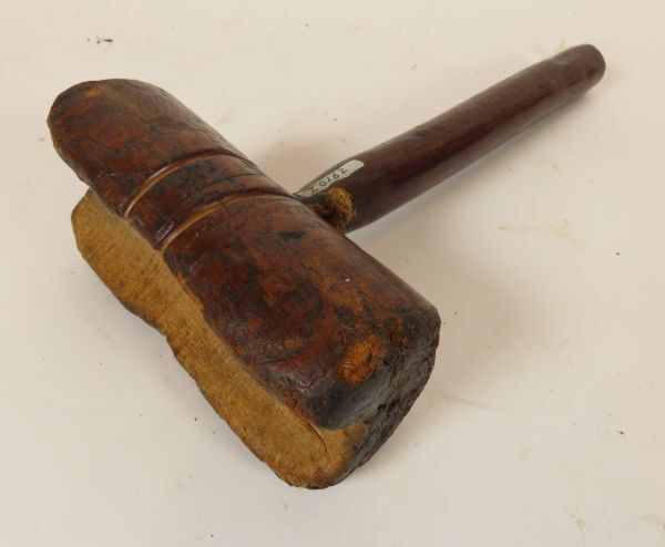 Houten hamer met een halfronde groef in de kop, die bij het bekleden van staaldraadsplitsen gebruikt wordt