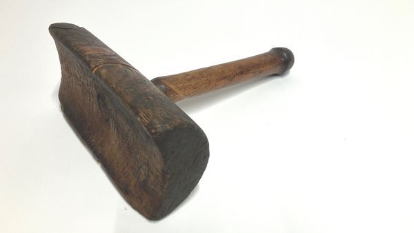 Houten hamer met een halfronde groef in de kop, die bij het bekleden van staaldraadsplitsen gebruikt wordt.