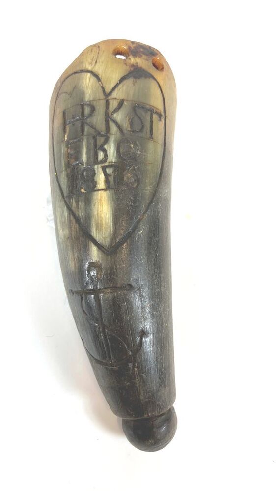 Hoorn met twee gaten aan de bovenzijde voor ophanging aan riem. Deel van hoorn van koe, stier of os. De hoorn bevat nog vet en is voorzien van gravures aan twee kanten; De spitse punt is bewerkt tot een bol.