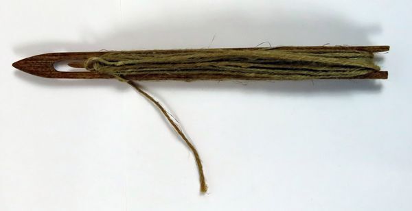 Houten boetnaald, pijlvormig, met een u-vormige uitsnijding boven, en een halfronde onder. Op de naald werd een hoeveelheid 'boetkatoen' gewikkeld (hier is ruw touw als voorbeeld gebruikt).