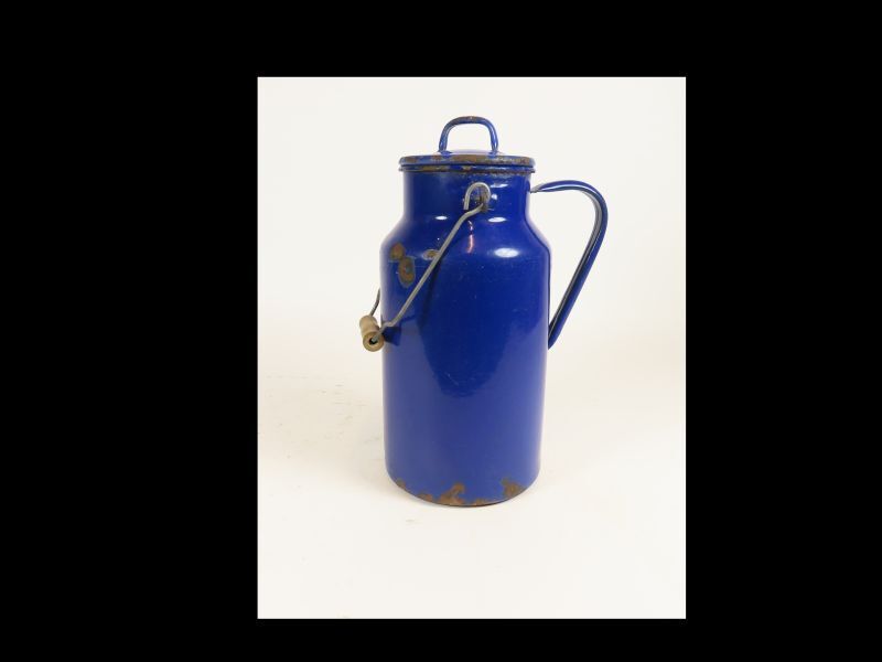 Melkbus, blauw geëmailleerd. Blauw van buiten en wit van binnen. Voorzien van een gebogen verticaal handvat op de losse deksel en een hengsel met houten handgreep.
