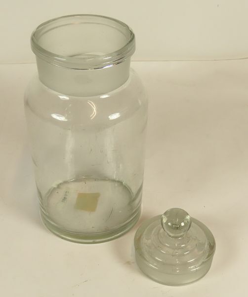 Grote fles van kleurloos glas met een losse geslepen glazen stop. Inhoud 2000 ml. De bovenzijde van de stop heeft drie niveaus rond de knop. De hals van de fles is eveneens geslepen.