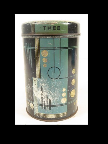 Rond theeblik met abstracte figuren in zwart, groen en goud, met los deksel. Onderin het groene vlak tekst "BEKKERS DORDRECHT(holland).