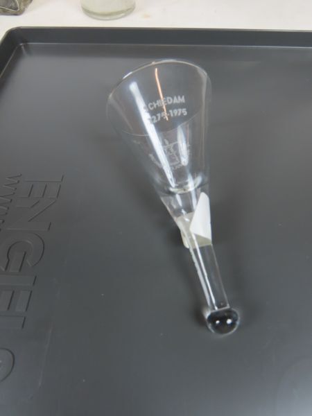 Taps toelopend borrelglas, een zogeheten puntje. Het glas heeft onderaan geen voet, maar een glazen bolletje. Op het glas zijn teksten en een afbeelding van een molen aangebracht.