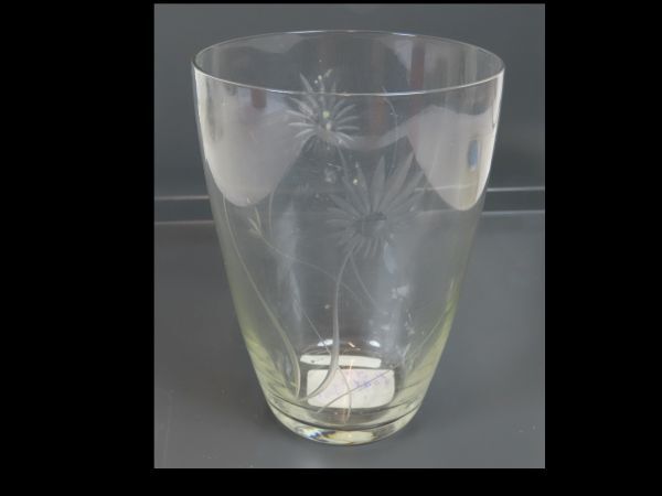 Drinkglas voor limonade met aan twee kanten een ingegraveerd bloemmotief. Glas loopt van boven naar beneden iets toe.