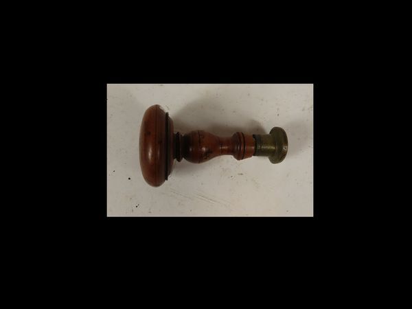 Stempel, zijnde een bruin houten zegelstempel met in het koperen stempelvlak een familiewapen.