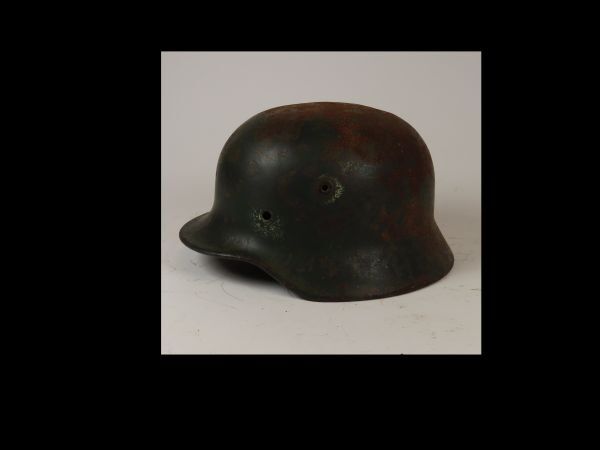 Helm, donkerkleurig, gebruikt door Duitse leger tijdens W.O. II. Helm heeft twee gaten aan beide zijkanten.
