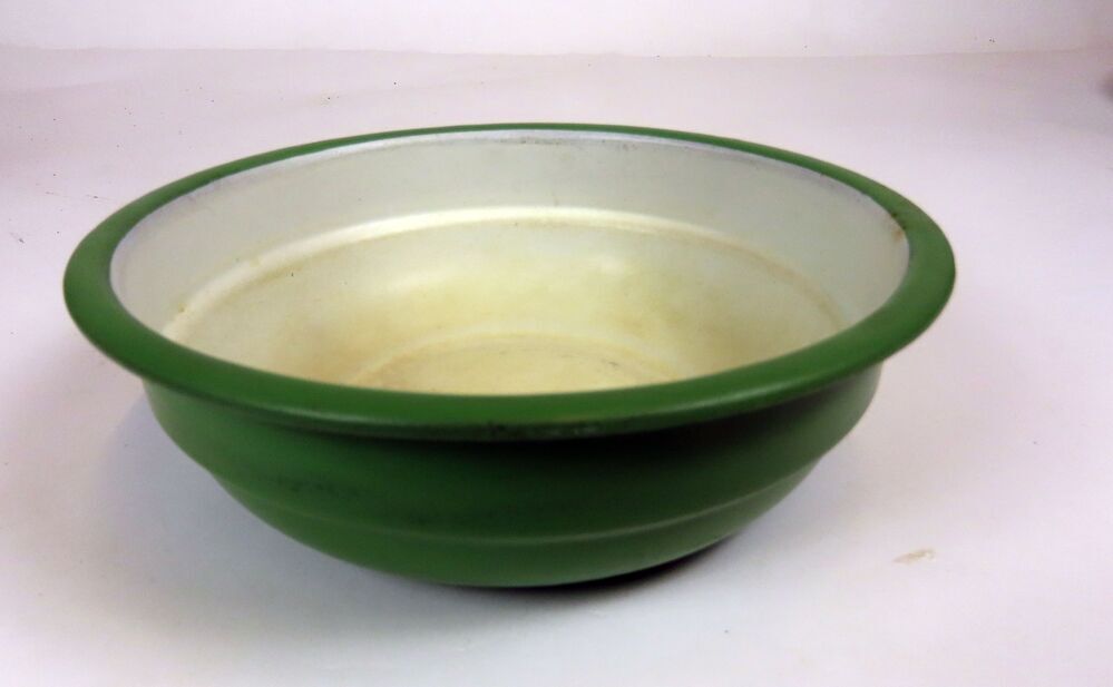 Schaal, groen emaille aan buitenzijde, wit emaille binnenzijde.