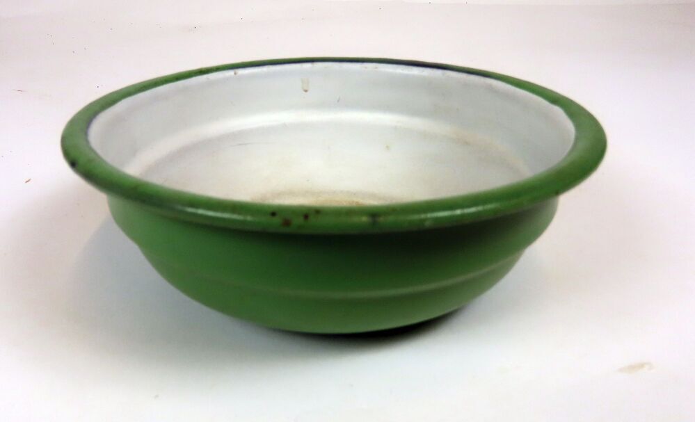 Schaal, groen emaille aan buitenzijde, wit emaille binnenzijde.