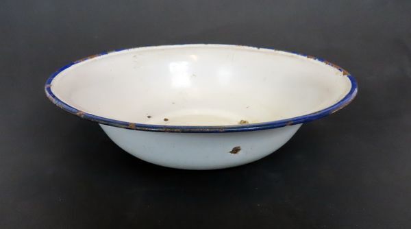 Schaal. wit emaille met blauwe rand.