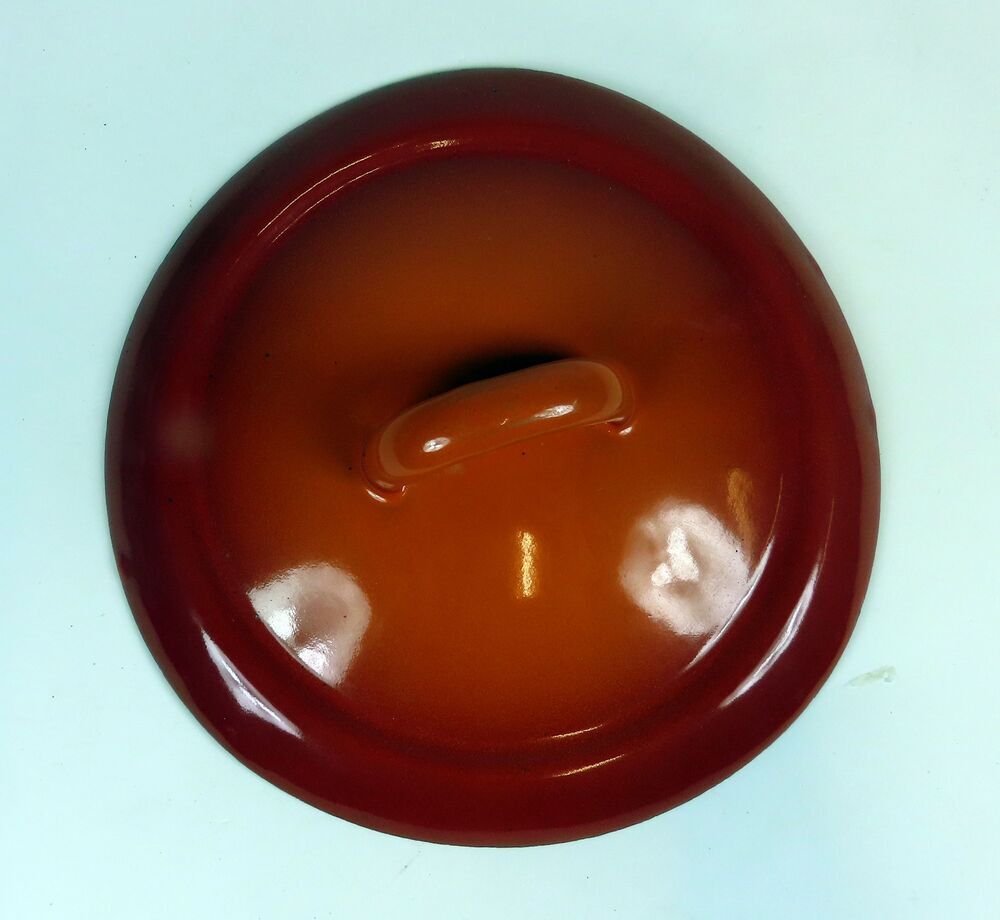 Pannendeksel met handgreep. Boven- en onderzijde oranje emaille.