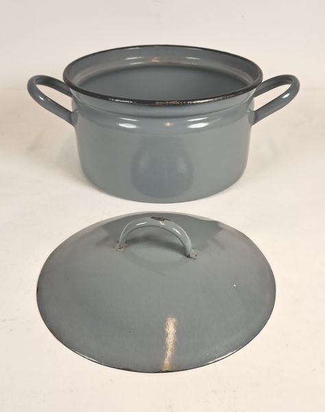 Grote grijs geëmailleerde kookpan met zwarte rand, twee handgrepen en deksel met handgreep.