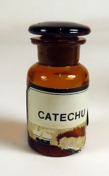 Flesje van bruin glas met geslepen glazen stop, zijnde een zogeheten apothekersfles. Het etiket vermeldt CATECHU, ook wel bekend als Cachou, een looistofhoudende, organische kleurstof, die werd gebruikt voor het tanen van touw, visnetten en katoenen zeilen. Ook wordt cachou gezien als een geneeskundige stof en gebruikt als smaakstof in drop.