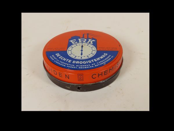 Rond bruinkleurig blik voor drogistenwas met rond oranje kleurig deksel met merkafbeelding.In de bodem is ingestanst BUS No 100.