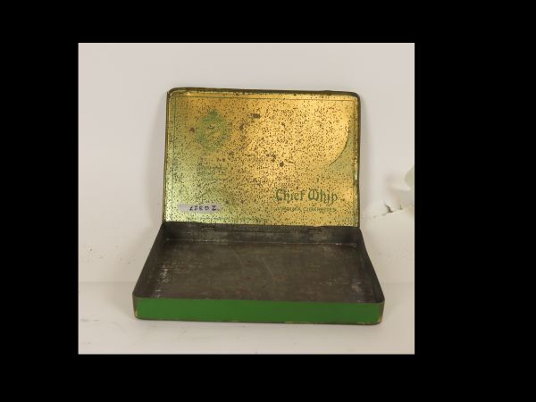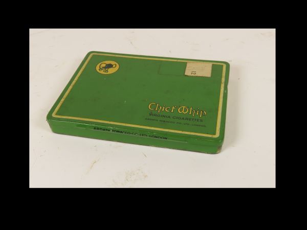 Groen rechthoekig sigarettenblik met naaldscharnier. Op bovenzijde deksel Tekst en medaillon met cap en stijgbeugels en rechtsonder de tekst "CHIEF WHIP Virginia cigarettes Ardath Tobacco Co.Ltd.London.