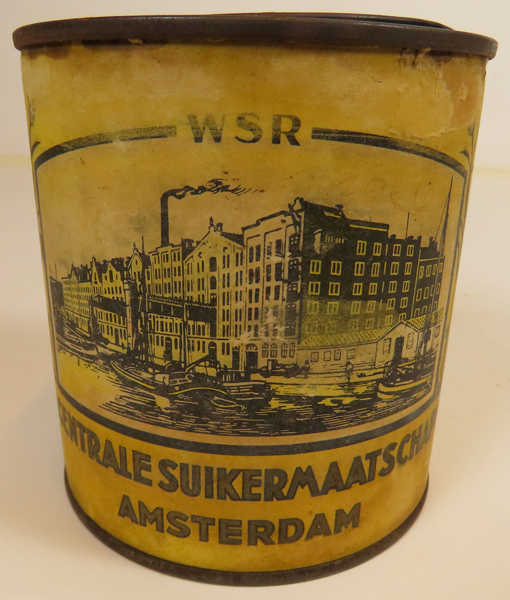 Blik met klemdeksel van de firma WSR. Deze cilindrische productverpakking is gebruikt voor stroop. Op het geel gekleurde papieren etiket (wikkel) staat goudkleurige belettering en een pentekening van de fabriek.