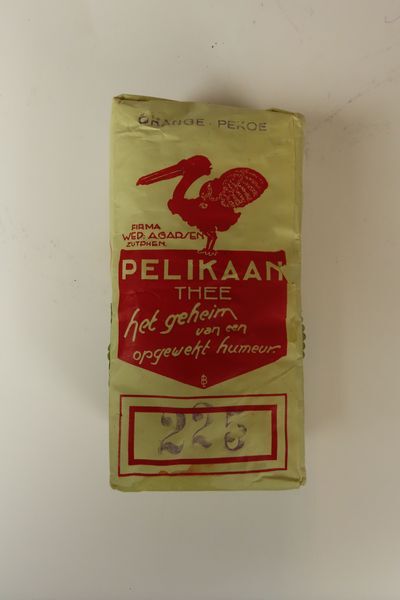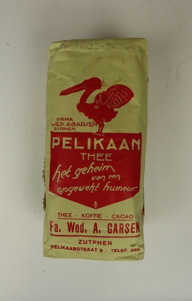 Thee, orange pekoe, verpakt in papieren zakje, merk Pelikaan.