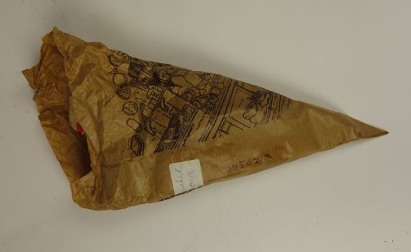 Papieren snoepzak met afbeelding van een snoepwinkel, ihoudend kaneelbrokken.