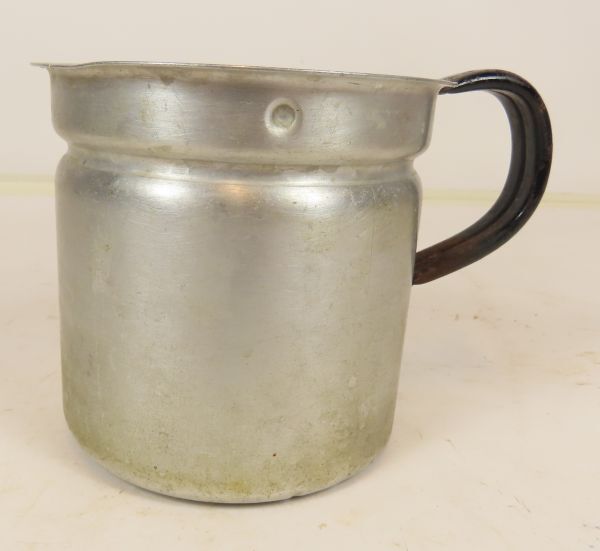 Kleine aluminium melkkoker met zwart handvat/oor en los inliggend deksel met ronde gaten tegen het overkoken.