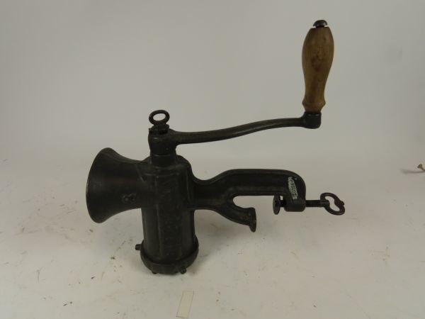 Gietijzeren gehaktmolen Husqvarna 8 Reliance. Dit model is met platen voor verschillende grofheden.