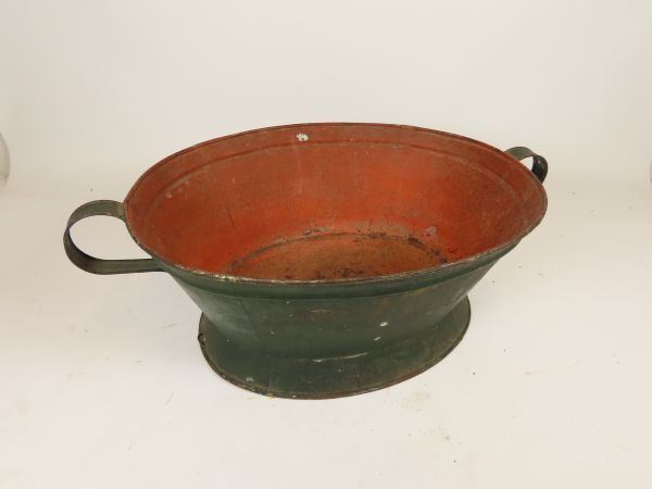 Metalen teil met 2 handvatten.De teil is groen aan de buitenkant en roodbruin aan de binnenkant.